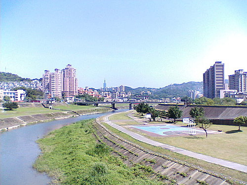 拎著菜散步一段路~~ 用手機隨手拍下 遠處的101大樓及陽光照在溪流上的清澈.....